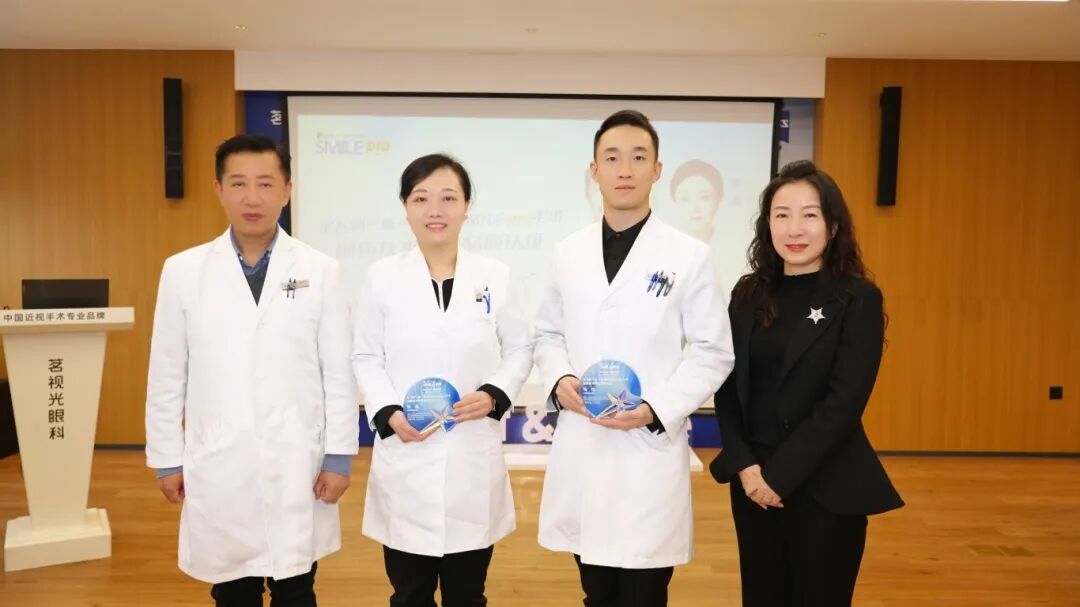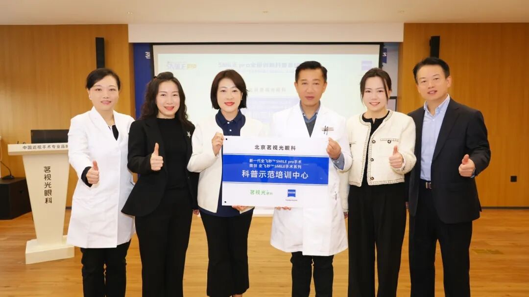继成为“微创全飞秒手术科普示范培训中心”后,北京茗视光眼科再次成为蔡司“新一代全飞秒SmilePro手术科普培训中心”,开班仪式上,蔡司公司全国患教支持经理潘泽女士为北京茗视光眼科正式颁授此牌,并给予北京茗视光眼科总院长助理张晶和建国门院区业务院长陶冶新全飞秒创新技术科普品质认证。